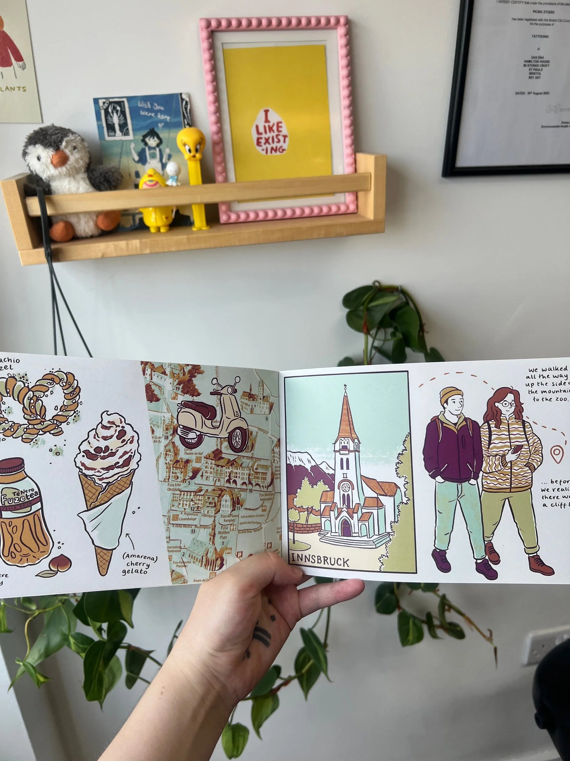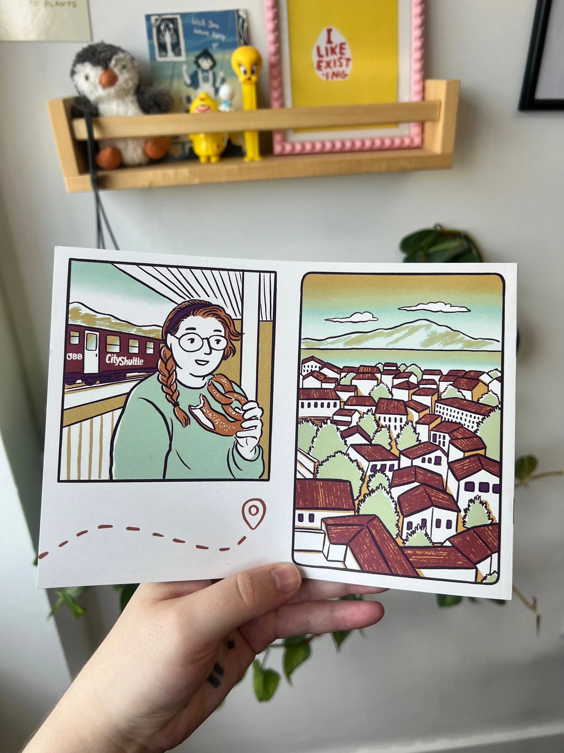 A travel zine about Savannah’s adventures interrailing around Europe with their partner. A couple of introverts travelling around Italy, Austria and Germany - spoiler alert, there's a lot of amazing scenery, delicious food and many naps involved! Includes mini comics, on-location drawings from their sketchbook and scrapbook pages!Details:- A5 size (14.8 x 21cm), 24 pages- Full colour digital print on 170gsm (covers) / 115gsm (inside pages) recycled paper- Printed in the UKFind me on:Instagram: @savannah.stormFacebook: @savannah.storm.illustrationwww.savannah-storm.com