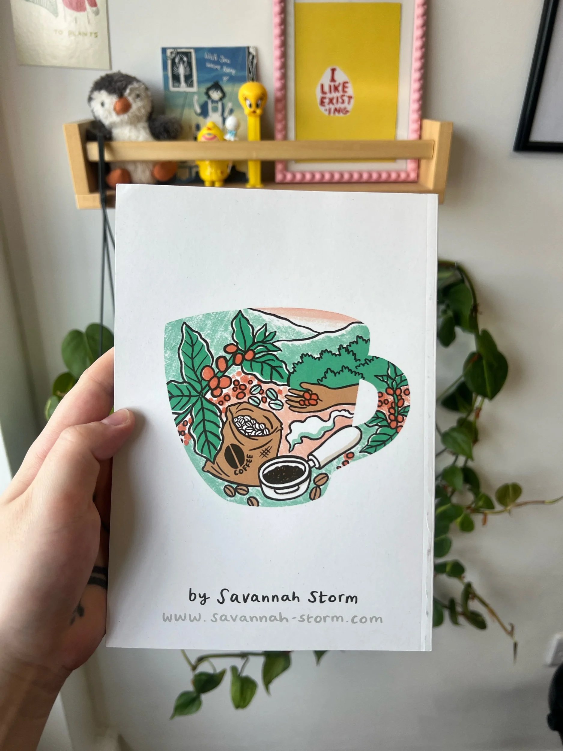 Just a Coffee, please' is a non-fiction comic zine, illustrating the journey that coffee takes to get to your cup. From growing coffee plants, harvesting the cherries and extracting the seeds, to roasting, releasing the aromas and flavours, to brewing the perfect cup of coffee; this comic explores the hard work involved from start to finish.It is easy to feel disconnected from the origins and processes it takes to produce things we sometimes take for granted. ‘Just a Coffee, please’ aims to draw attention to the true cost of coffee.Printed in the UK on recycled paper, 36 pages.Updated version for 2025! Now includes an extra section on how to pour latte art!Instagram: @savannah.stormFacebook: @savannah.storm.illustrationwww.savannah-storm.com