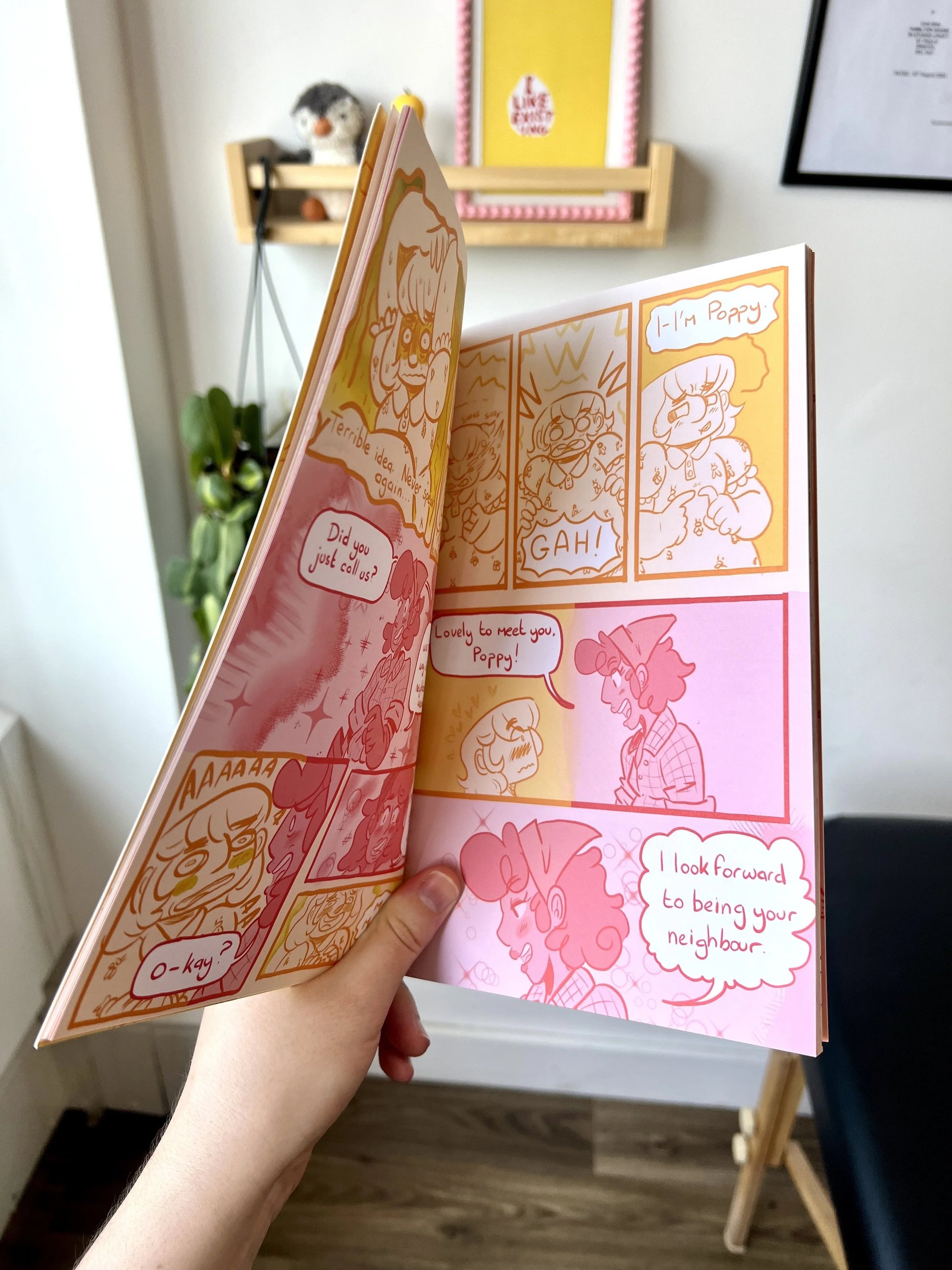 The story of Poppy, a hapless romantic Honey Farmer/Beekeeper and Marnie an extroverted, confident strawberry farmer. Over one farmers market weekend will Poppy manage to work up the courage to ask Marnie out??An LGBTQ+ Rom-Com suitable for all ages, comic is printed with a yellow and pink colour scheme throughout