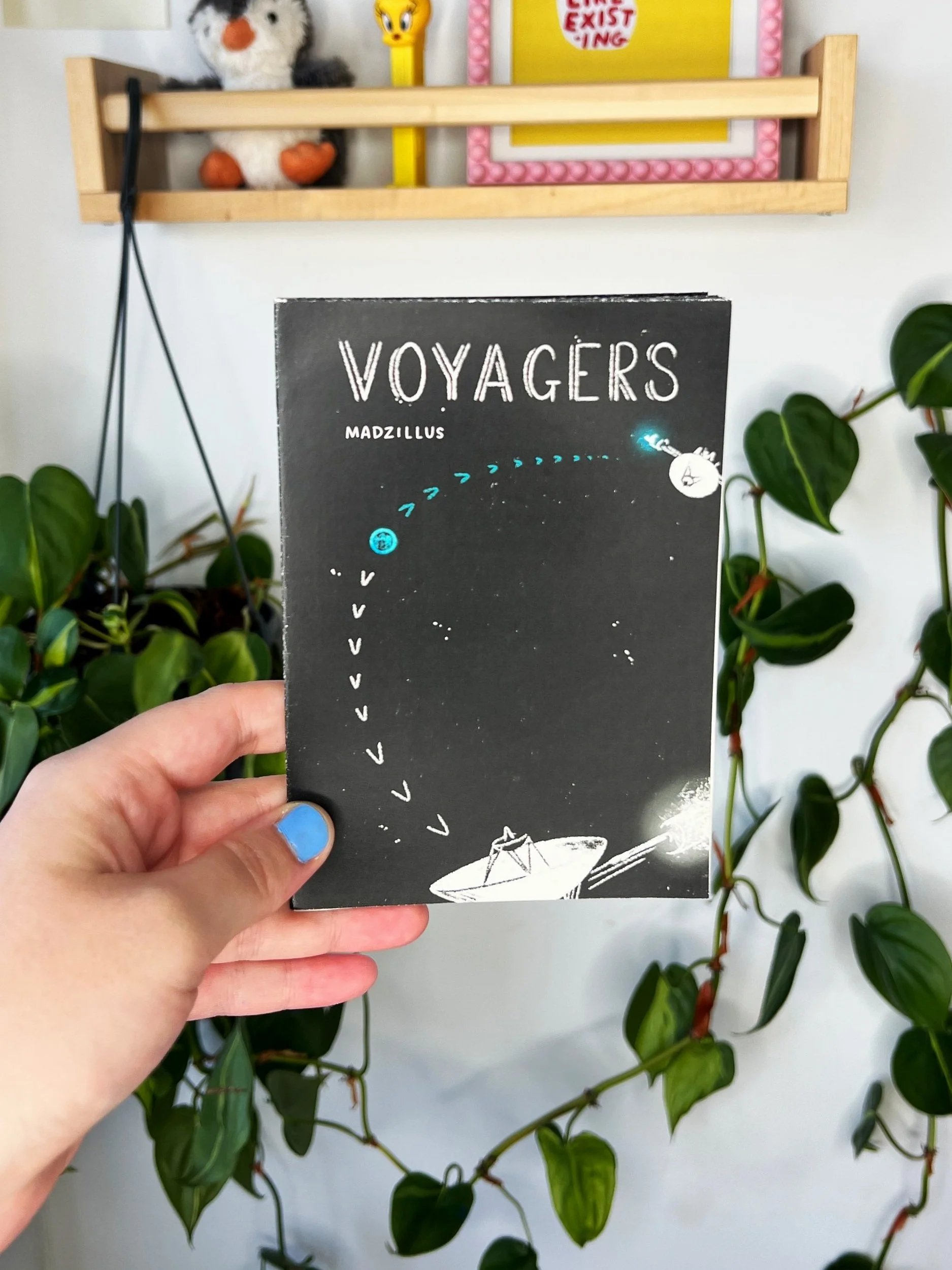A (mostly) fictional, slightly informative comic about the Voyager 1 and 2 space probes launched in the 1970s. This quiet, emotional story follows their journey through deep space, their fading connection, and the spark of hope that remains. For fans of bittersweet sci-fi and space melancholy.To find out more about the artist : https://www.instagram.com/madzillus/