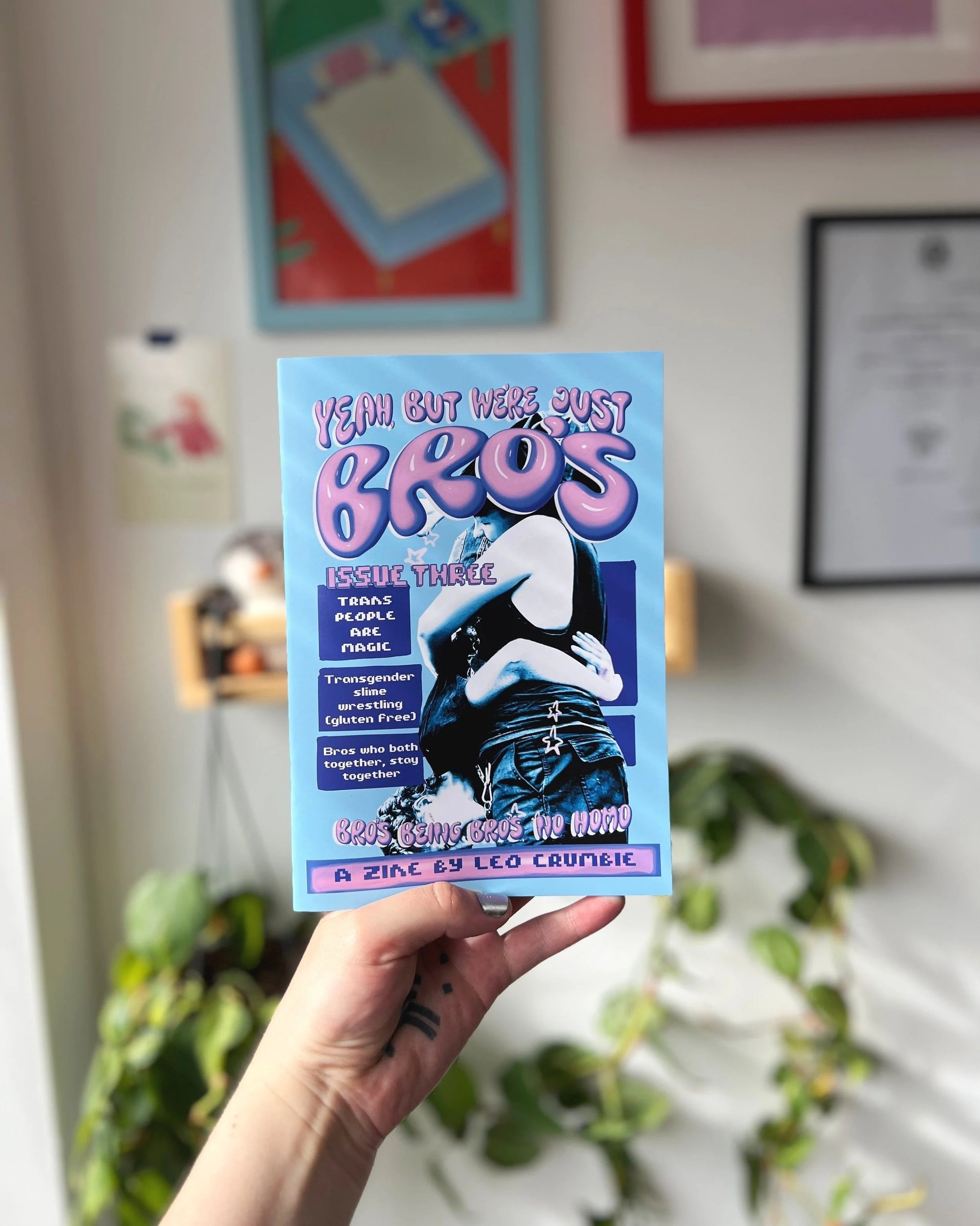 “Have you ever had a bath with your bro? Ever kissed your bro but it’s not gay because you had socks on. Made out with your bro on a night out? Had such an intense arm wrestle your biceps were just pumping, the eye contact was so intense that you just made out ? That’s how it worked at t-boys club anyway. If you relate to even one of these event,s then I believe this zine is for you. “ Leo Crumbie
